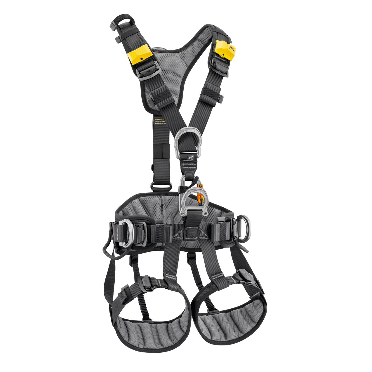 - Todas las zonas de contacto, tirantes, cinturón y perneras, con espuma preformada y acolchada de tejido transpirable, permiten al usuario evolucionar y trabajar confortablemente.